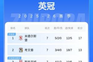 積分榜方面,米德爾斯堡5勝2平領(lǐng)跑,蘭帕德執(zhí)教的考文垂3勝4平排在第二。萊斯特城第5,伊普斯維奇少賽1場排在第12。