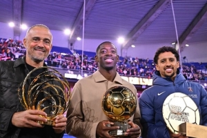 登貝萊在獲得金球獎,馬爾基尼奧斯作為隊長則拿著巴黎的最佳男足俱樂部獎,恩里克則獲得蘇格拉底獎,巴黎官推曬出三人三獎杯的合影并寫道:“集體的力量?!?/p>
