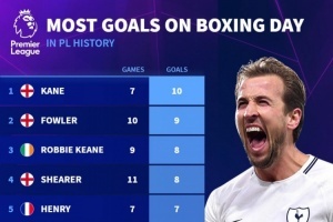 體育資訊12月25日訊 德國轉(zhuǎn)會市場統(tǒng)計了球員節(jié)禮日(12月26日)在英超的進球數(shù)量,并列出英超歷史節(jié)禮日進球榜,凱恩10球居首,福勒9球次席。