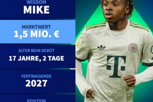 體育資訊9月28日訊 在本輪德甲拜仁4-0大勝不萊梅的比賽中,17歲小將麥克替補(bǔ)登場迎來一線隊(duì)首秀。