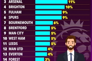 調(diào)查結(jié)果揭示了明顯的南北著裝差異,榜單前七名均被來自倫敦和南部的球隊包攬。曼城、利茲聯(lián)、布倫特福德和西漢姆聯(lián)以5%的數(shù)據(jù)并列第八。