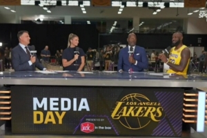 在即將結(jié)束與湖人官方轉(zhuǎn)播商Spectrum SportsNet的專訪時(shí),主持人問道:“明年媒體日咱們?cè)僖???/p>