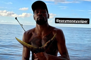 休賽期,杜蘭特在巴哈馬與新隊(duì)友共度時(shí)光,加入了一次由史蒂文-亞當(dāng)斯、杰肖恩-泰特和凱文-哈里斯組織的釣魚之旅。