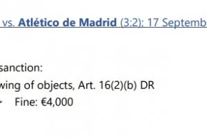 馬競方面,與利物浦的比賽中,西蒙尼與一名在90分鐘內(nèi)持續(xù)辱罵他的利物浦球迷發(fā)生了沖突,隨后吃到紅牌。西蒙尼的行為違反體育道德,被歐足聯(lián)處以歐冠停賽1場的處罰,因此西蒙尼將無法在歐冠主場對(duì)陣法蘭克福的比賽中現(xiàn)場指揮。