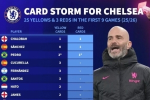 體育資訊10月1日訊 德國轉(zhuǎn)會(huì)市場(chǎng)統(tǒng)計(jì),切爾西新賽季前9場(chǎng)比賽,領(lǐng)到25張黃牌和3張紅牌。
