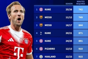 本賽季開局,凱恩僅用742分鐘時間就為拜仁造了20個進(jìn)球(進(jìn)球+助攻),比2011年的梅西快了7分鐘,刷新歷史。