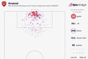 不包括烏龍球(因為沒有預期進球值),阿森納在這段時間里預期進球28.1的情況下攻入32球。僅看本賽季,阿森納在英超中主罰了45個角球,比任何其他球隊至少多4個,其中賴斯主罰了24個。這些角球產生了18次射門,其中有6次轉化為進球。這意味著阿森納在超過三分之一的角球進攻中都能形成射門,并且有三分之一的射門能夠成功得分。