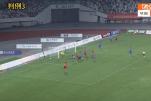 判例三:中甲聯(lián)賽第24輪,蘇州東吳vs南京城市。比賽第48分鐘,蘇州東吳6號(hào)隊(duì)員頭球射門(mén),南京城市守門(mén)員將球撲出,助理裁判員示意球的整體已經(jīng)越過(guò)球門(mén)線(xiàn),裁判員判蘇州東吳隊(duì)進(jìn)球得分。