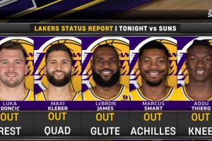 缺陣理由:東契奇休息、克萊伯四頭肌、詹姆斯臀大肌受傷、斯瑪特跟腱、阿杜膝蓋