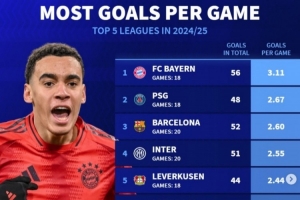 體育資訊1月24日訊 《轉(zhuǎn)會市場》今日統(tǒng)計了本賽季五大聯(lián)賽場均進(jìn)球情況,拜仁以3.11球居首。