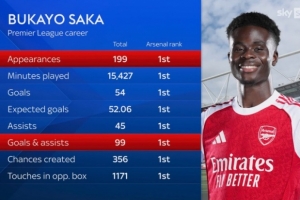 體育資訊10月4日訊 薩卡將迎來英超出戰(zhàn)200場里程碑,天空體育統(tǒng)計(jì)了薩卡首秀以來的英超數(shù)據(jù),他的出場次數(shù)、進(jìn)球、助攻等多項(xiàng)數(shù)據(jù)阿森納隊(duì)內(nèi)同期居首。