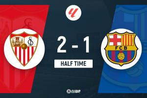 上半場(chǎng)傷停補(bǔ)時(shí)6分鐘,半場(chǎng)結(jié)束,巴薩暫1-2塞維利亞。