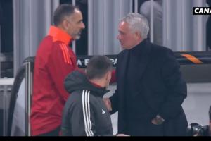體育資訊01月24日訊 費內巴切歐聯(lián)0比0戰(zhàn)平里昂,賽后穆里尼奧與里昂主帥握手致意時鬧了笑話,他把里昂理療師當成了主帥,在前者的提醒下,穆帥最終成功地與里昂主帥薩吉握到了手。