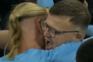 曼城官方社媒曬出視頻,哈蘭德賽后將球衣贈(zèng)送給一名球迷,后者與哈蘭德?lián)肀?,并親吻了他的臉頰。