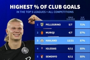 體育資訊10月7日訊 德國轉會市場統(tǒng)計了本賽季球員進球占比,哈蘭德攻入曼城57%的進球,占比并列第二高,姆巴佩54%、凱恩47%。
