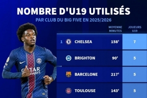 本賽季五大聯(lián)賽球隊使用U19球員數(shù)量排名(括號內(nèi)為平均出場時間):
