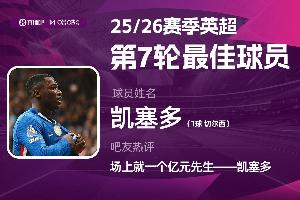 2025-2026賽季英超火熱進(jìn)行中,體育資訊和咪咕體育聯(lián)合發(fā)起每輪英超最佳球員評選活動!第7輪評選結(jié)果出爐,切爾西后腰凱塞多攻防兼?zhèn)洌Z入世界波幫助切爾西2-1戰(zhàn)勝利物浦,獲得吧友5.6萬票的支持,當(dāng)選 【體育資訊X咪咕體育英超第7輪最佳球員】!