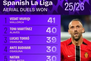 體育資訊10月7日訊 日前,Squawka統(tǒng)計(jì)了本賽季西甲爭頂成功次數(shù)排行,赫伊森21次位居第八。