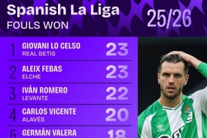 體育資訊10月7日訊 日前,Squawka統(tǒng)計了本賽季西甲被犯規(guī)次數(shù)排行,洛塞爾索23次居首,朱利亞諾-西蒙尼18次并列第五。