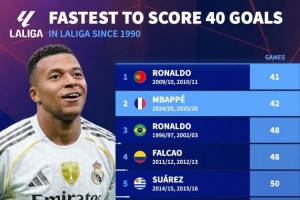 體育資訊10月8日訊 德國轉(zhuǎn)會(huì)市場列出了1990年以來最快達(dá)成西甲40球榜單,C羅41場居首,姆巴佩42場次席。