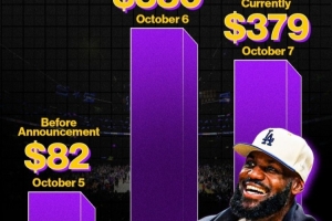 體育資訊10月8日訊 根據(jù)二手票務(wù)平臺(tái)的報(bào)道,在詹姆斯發(fā)布“決定二”預(yù)告前,湖人新賽季最后一個(gè)主場(chǎng)最便宜的票價(jià)為82美元。而隨著詹姆斯發(fā)布預(yù)告,最低票價(jià)上漲到580美元。