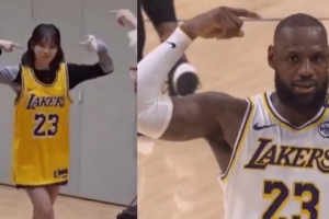 許允真在表達(dá)詹姆斯是自己最喜歡的球員之后,將球傳給了金采源,“采源布朗”完成了暴扣,隨后全隊(duì)開始模仿詹姆斯的慶祝動(dòng)作。
