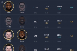 詹姆斯、東契奇同場時(shí),凈效率+1.9