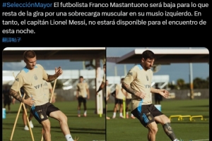 阿根廷官方寫道:“球員馬斯坦托諾的左大腿肌肉過度疲勞,將缺席接下來的巡回比賽。與此同時(shí),隊(duì)長(zhǎng)梅西也將缺席今晚的比賽。”