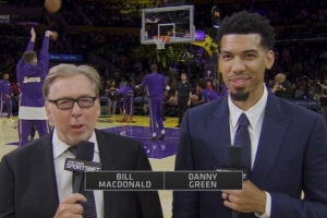 體育資訊10月13日訊 今日前NBA球員、現(xiàn)湖人電臺(tái)Spectrum SportsNet解說(shuō)員丹尼-格林現(xiàn)場(chǎng)解說(shuō)湖人VS勇士的季前賽。