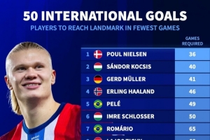 體育資訊10月13日訊 在上周對(duì)陣以色列的世預(yù)賽中,哈蘭德上演帽子戲法,這讓他成為歷史上第4快打入國(guó)家隊(duì)第50球的球員。作為對(duì)比,梅西用了107場(chǎng)才達(dá)到這一里程碑,而C羅則用了114場(chǎng)。德轉(zhuǎn)列出了達(dá)成國(guó)家隊(duì)50球所用場(chǎng)次最少的球員?。