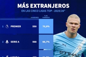 體育資訊10月14日訊 根據(jù)德國轉會市場的數(shù)據(jù),本賽季五大聯(lián)賽英超外籍球員占比最高,西甲外籍球員占比最低。