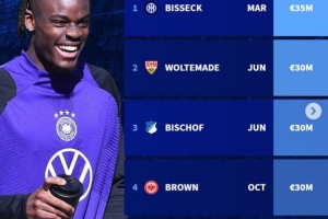 以下為2025年為德國隊(duì)上演首秀球員身價(jià)情況(首秀時(shí)間為當(dāng)時(shí)所在俱樂部):