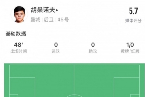 體育資訊1月26日訊 本輪英超,半場曼城1-1切爾西。胡桑諾夫半場數(shù)據(jù):