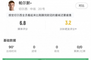 體育資訊1月26日訊 英超第23輪,曼城3-1切爾西。帕爾默本場(chǎng)數(shù)據(jù):
