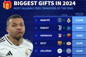 體育資訊12月25日訊 《轉(zhuǎn)會市場》在今日統(tǒng)計了2024年免簽球員身價榜,姆巴佩無懸念領(lǐng)跑。