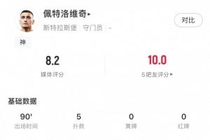本場比賽中,切爾西外租白堡門將佩特洛維奇送出了5次成功撲救,3次高球攔截,1次解圍,幫助球隊以2-1的比分獲勝。