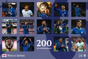 切爾西官推曬出海報(bào),并寫道:“200場(chǎng)里程碑取得進(jìn)球,里斯-詹姆斯是純血切爾西人?!?/p>