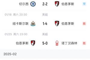 體育資訊01月26日訊 英超第23輪,伯恩茅斯5-0大勝諾丁漢森林,聯賽已11場不敗。