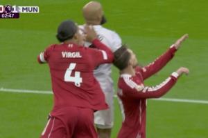 體育資訊10月19日訊 英超第8輪利物浦vs曼聯(lián),曼聯(lián)先進一球,第1分鐘姆伯莫破門。進球前的爭頂,范迪克爭頂中肘擊麥卡利斯特!