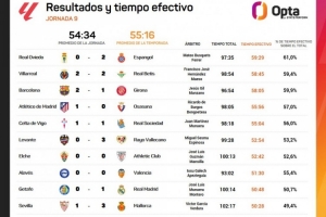 體育資訊10月21日訊 OPTA統(tǒng)計(jì)了西甲第九輪各場(chǎng)比賽的有效時(shí)間,沒有任何一場(chǎng)比賽的有效時(shí)間超過60分鐘。