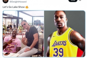 前湖人球員霍華德更新推特,他曬出了自己與佩林卡的合照,和自己身穿湖人39號的P圖,寫道:“湖人,加油!”