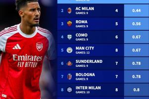 1-阿森納(12場(chǎng)丟3球,場(chǎng)均0.25)