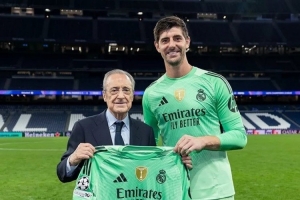 庫爾圖瓦達(dá)成皇馬生涯出戰(zhàn)300場(chǎng)里程碑,俱樂部主席弗洛倫蒂諾向他頒發(fā)了紀(jì)念球衣。