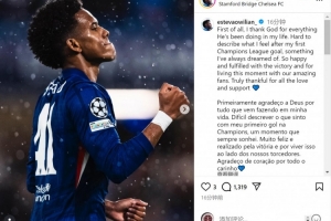 埃斯特旺社媒曬出慶祝進球的照片,配文:“首先我要感謝上帝在我生命中的一切恩典。難以描述攻入個人首個歐冠進球時的感受——這是我一直以來的夢想。”