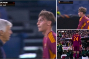 《羅馬體育報》表示,齊奧爾科夫斯基對這次換人很不滿,他先是冷眼看向羅馬主帥加斯佩里尼,勉強和對方握手,隨后回到替補席。羅馬老將克里斯坦特主動和他擊掌,試圖安慰這位小將。而齊奧爾科夫斯基坐在替補席上也不停嘟囔著,顯然很不開心。而羅馬領(lǐng)隊托達(dá)羅之后也來到一旁和他交談,可能是在安撫他。