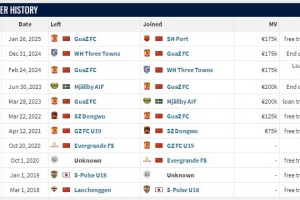 德轉官方網(wǎng)站今天在艾菲爾丁的轉會紀錄添加了轉會海港的紀錄:2025年1月26日,艾菲爾丁從廣州隊轉會上海海港,轉會形式為自由轉會。