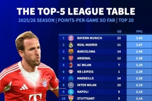 體育資訊10月25日訊 《轉(zhuǎn)會市場》統(tǒng)計(jì)了本賽季五大聯(lián)賽球隊(duì)的場均拿分情況,拜仁、皇馬、巴薩、阿森納分列前四。