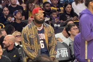 據(jù)現(xiàn)場記者Dan Woike分享的照片,本場因傷缺陣的詹姆斯身穿小兒子布萊斯在亞利桑那大學的球衣到場觀賽。