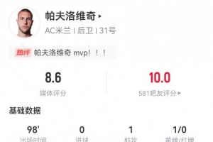 體育資訊1月26日訊 米蘭在本輪意甲3-2逆轉(zhuǎn)帕爾馬,帕夫洛維奇本場(chǎng)數(shù)據(jù)如下: