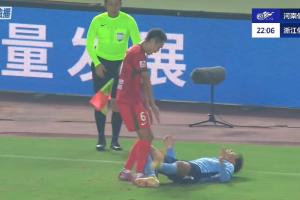 體育資訊10月25日訊 河南vs浙江第23分鐘,張璦暉倒地夾住皮球,王上源上去對(duì)著皮球一通踢。